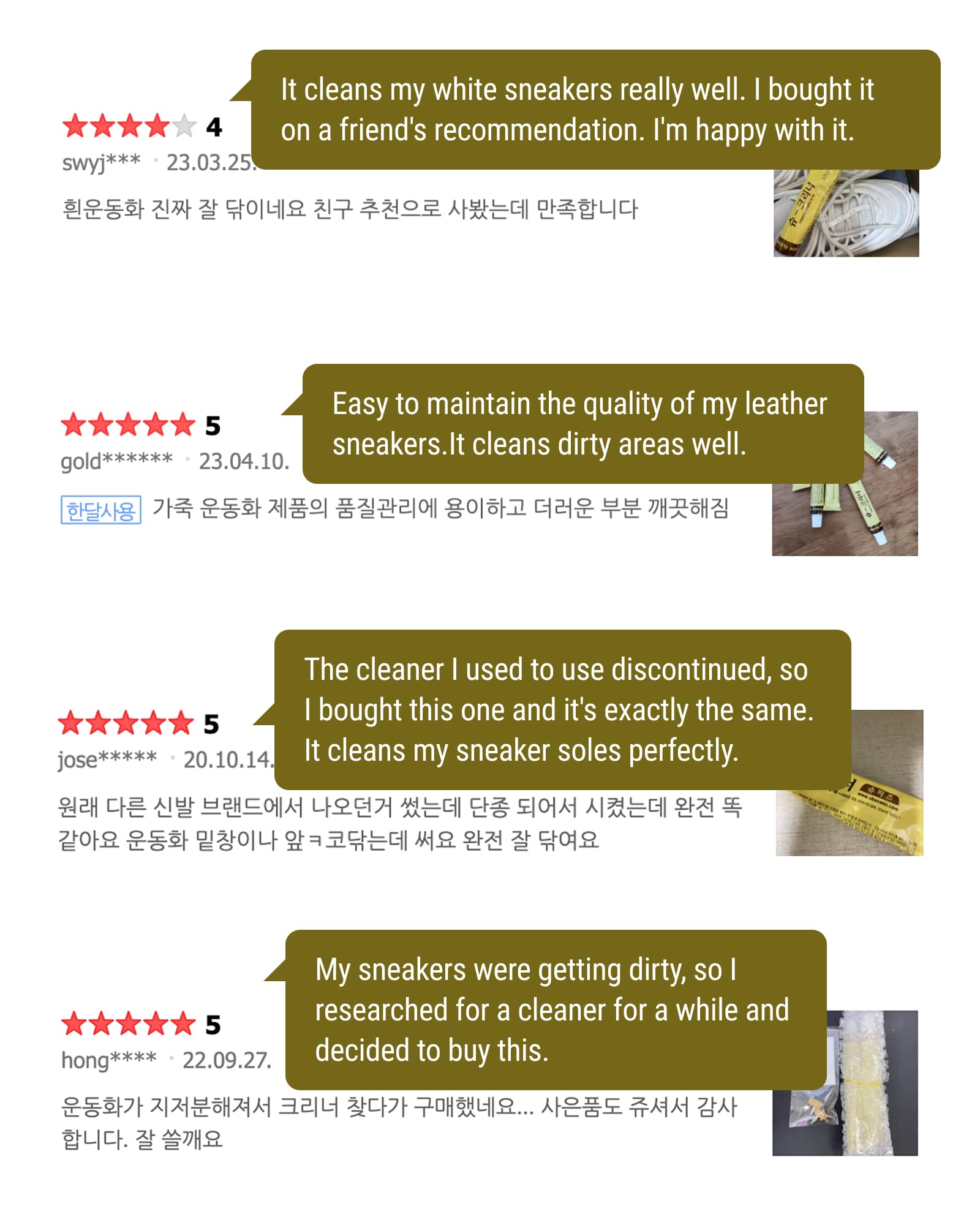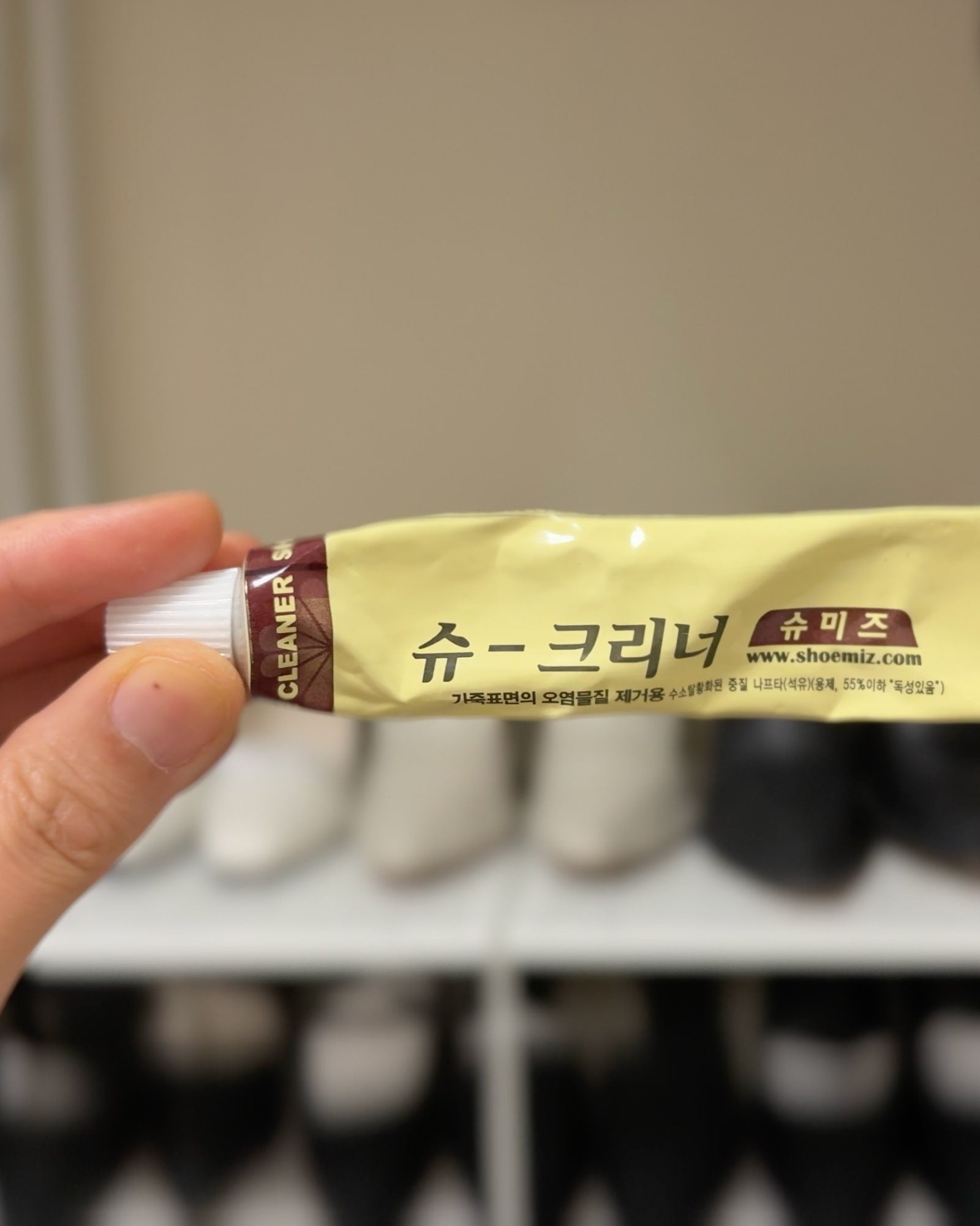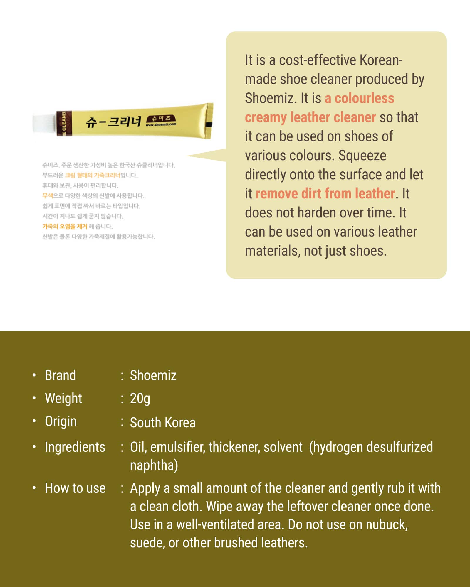 It is a cost-effective Korean-made shoe cleaner produced by Shoemiz. It is a colourless, creamy leather cleaner so that it can be used on shoes of various colours. Squeeze directly onto the surface and let it remove dirt from leather. It does not harden over time. It can be used on various leather materials, not just shoes.